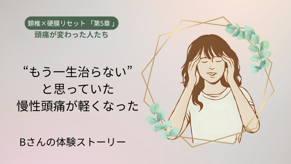 【“もう一生治らないと思っていた”Bさんの慢性頭痛が軽くなった理由】 第5章では、実際に頭痛が変化した方々の体験談をご紹介しています。今回は10年以上も「もう一生治らない」と諦めていたBさんの頭痛が、少しずつ軽くなっていったプロセスをお伝えしま...